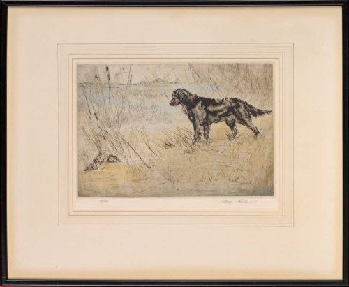 A BLACK GUN DOG AND THREE PARTRIDGES