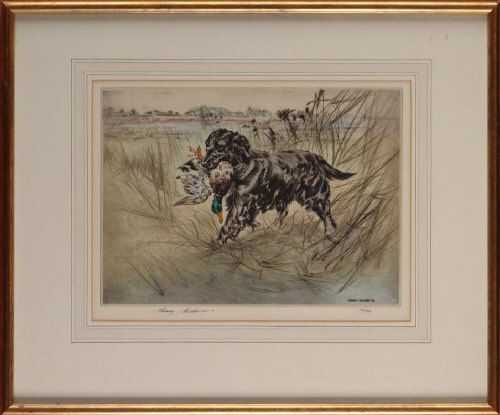 A BLACK GUN DOG RETRIEVING A MALLARD DUCK