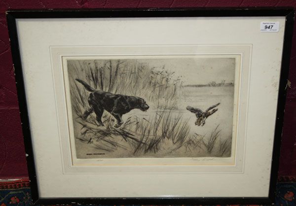 Black labrador and duck