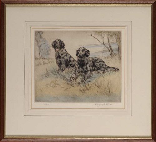 TWO BLACK GUN DOGS RESTING IN A FIELD
