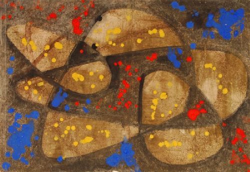 Gelbe, blaue und rote Tropfen auf schwarzbraunem Grund