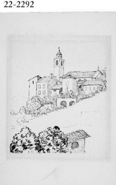 Gebirgsdorf im Tessin, von Kirche bekrönt.