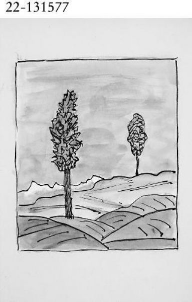Weite Landschaft mit zwei Bäumen, am Horizont eine Bergkette