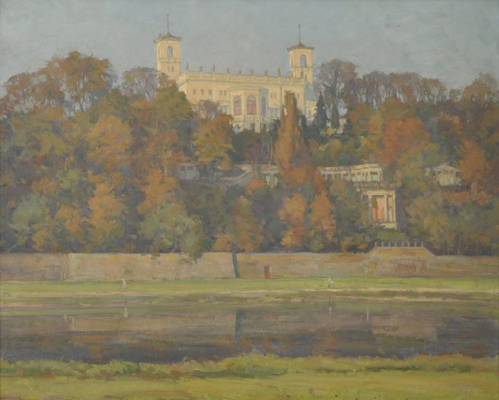 | Dresden Herbstliche Ansicht von Schloss Albrechtsberg in Dresden, vom Käthe-Kollwitz-Ufer aus | |