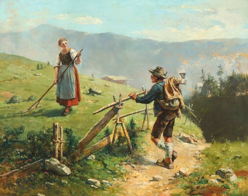 Alpine landscape with a young couple conversing