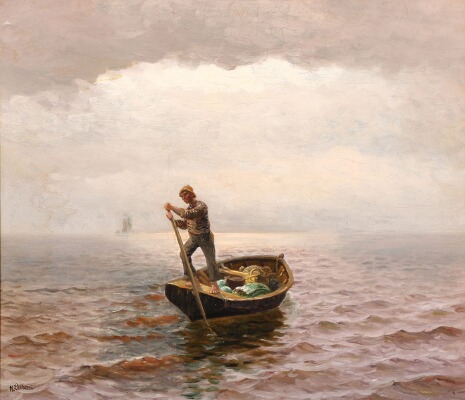 | Seascape with a fisherman in a rowing boat, early morning | |