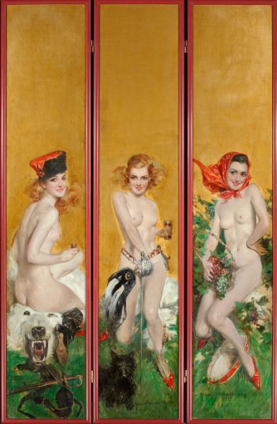 | Triptych of Three Nudes, Hunting, Fencing, and Tambourine, decorative folding screen | |