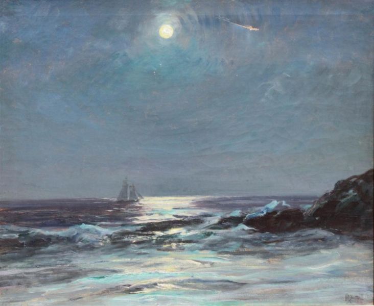 FISHING SCHOONER IN MOONLIGHT - MAINE COAST