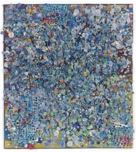 | Acrylic watercolor, gouache, glitter, confetti, and string on paper glued to a board | |