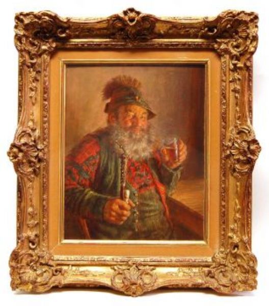 Bärtiger Alter in Tracht mit Pfeife und Glas
