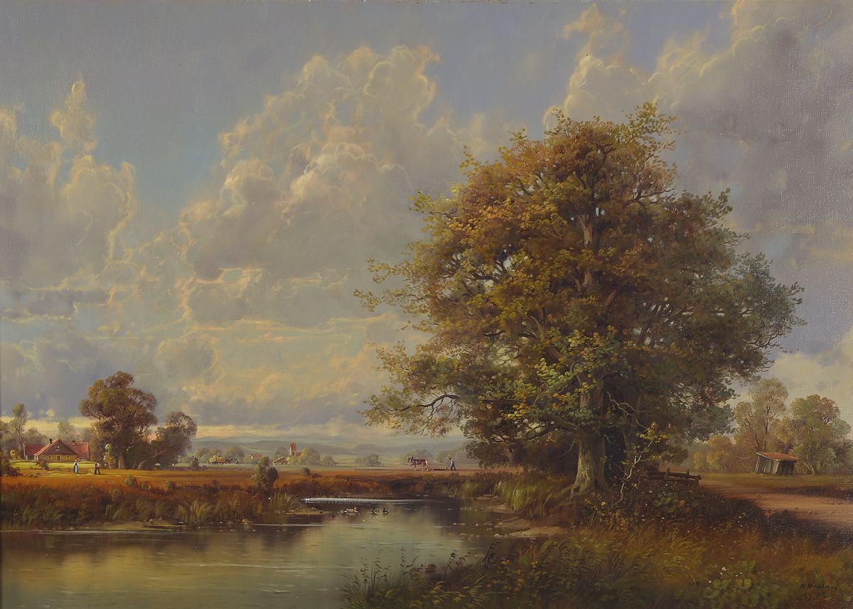 | South German lake landscape with peasant bustle in the background, very well met cloud formations in the back light, skillful de | |