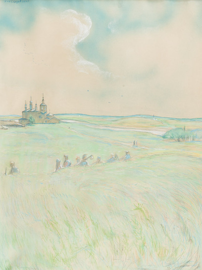 Weite Landschaft mit mächtigem Kloster und Erntearbeitern