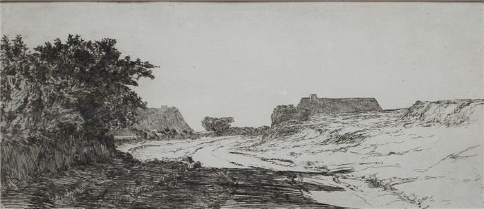 | Landweg mit Gebüsch, das Schatten wirft, hinten Häuserdächer | |
