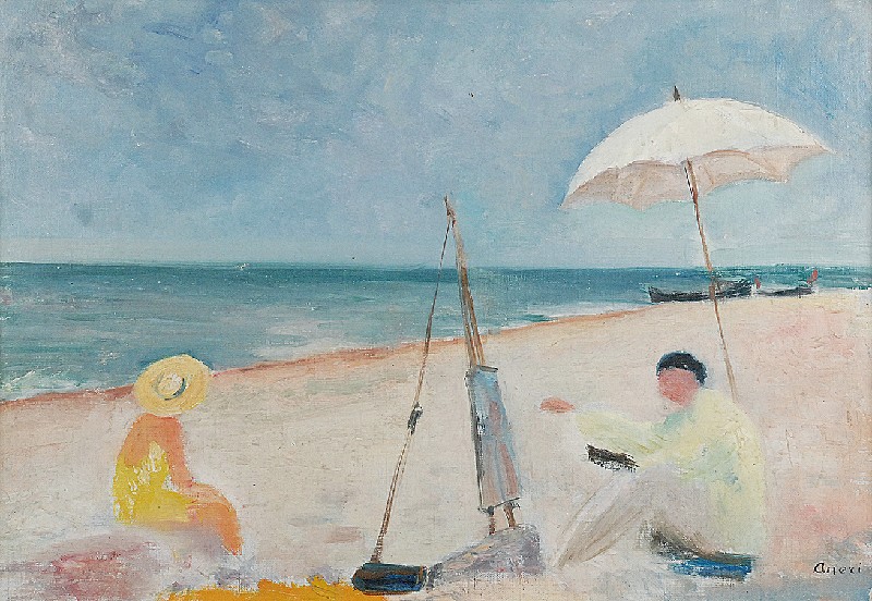 Na plaży I - Artysta i jego modelka - Wojciech Weiss malujący nad morzem, 1935