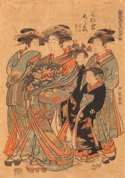 | Oiran, kurtyzana wysokiej rangi ze służkami kamuro, Rycina z cyklu: Hinagata wakana -no hatsu moy o, (Przykładowe wzory wiosenne | |