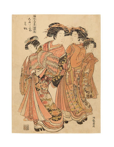 An oban tate-e print entitled Oishiya nai Wakamatsu to kamuro (Wakamatsu of the Oishiya, and kamuro), from the series Hinagata wakana no hatsu moyo (Models for Fashion: New Year Designs as Fresh as Young Leaves), circa 1765-1804, published by Nishimu | |