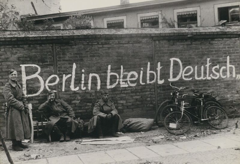 | Amused Russian Soldiers in front of a German War Slogan, Berlin. 1945 | |