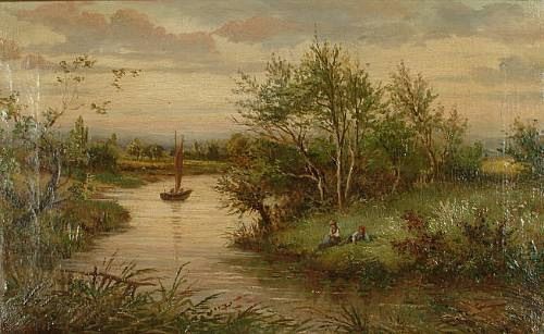 Figures resting by a river in a country landscape