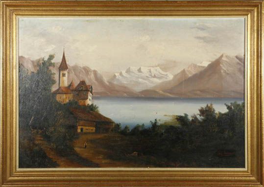 | Blick auf Oberhofen am Thuner See, im Hintergrund die verschneiten Berge der Alpen | |