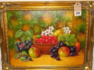 | Still Life of Fruit including apples, black grapes, blackberries and a bowl of cherries beside a moss covered stone wall | |