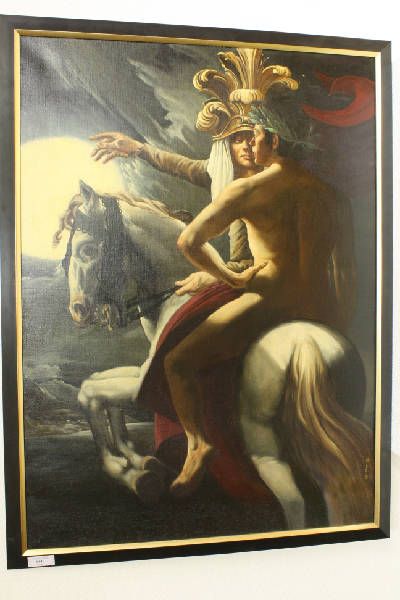 Oosterse mythologische scène twee figuren op wit paard