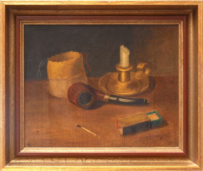 Stilleben mit Kerze, Pfeife, Tabaksbeutel und Zündholzschachtel vor changierendem Hintergrund