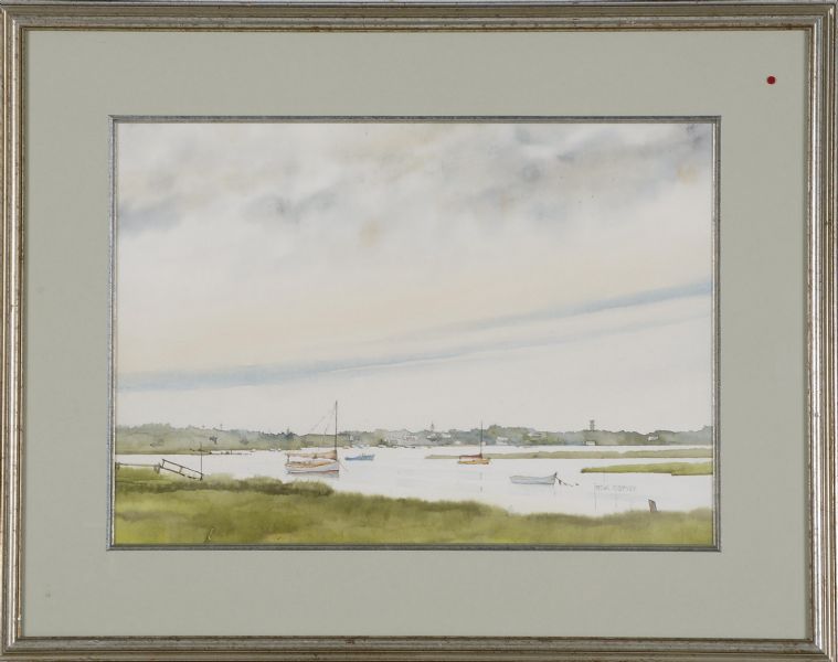 Oyster Pond, Chatham, with moored boats and steeples in distance