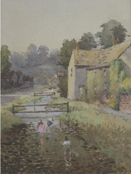 playing in a roadside stream close to cottages