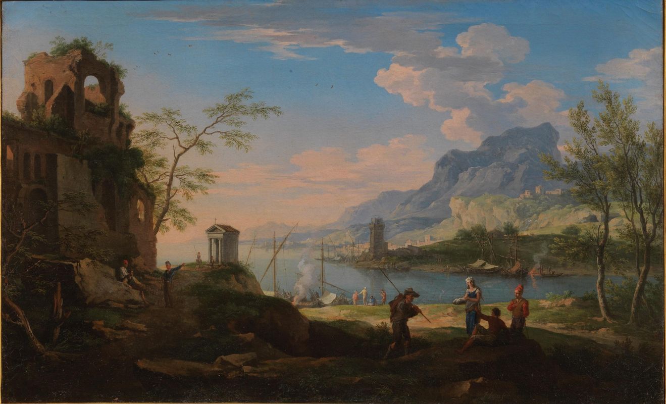| PAESAGGIO COSTIERO CON ROVINE ANTICHE MARINA CON BARCHE E FIGURE | |