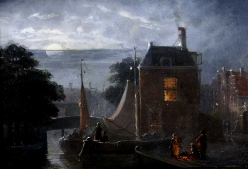 Flusslandschaft im Mondschein mit Gebäuden, Boot und Personen am Lagerfeuer.