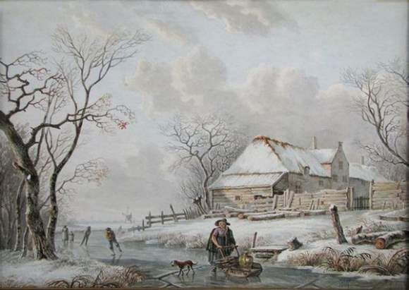 | Tief verschneite, niederländische Flusslandschaft mit Schlittschuhläufern und Reisigsammlerin, am Ufer Windmühlen und Gehöfte | |