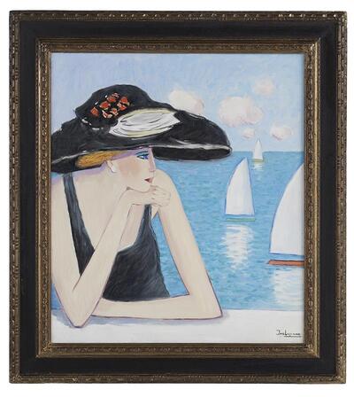 | Lady in Black Hat Gazing at the Sailboats at Sea | |