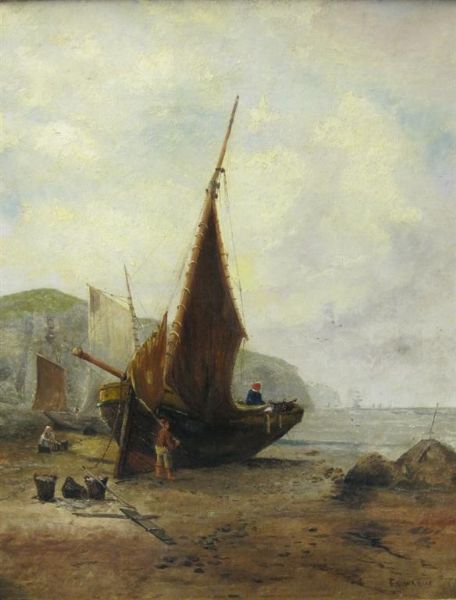 Shore view with Fisherfolk by a beached Boat