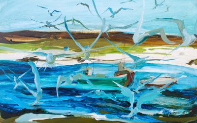 Seagulls surrounding a fishing boat