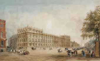 | The Treasury, Whitehall, with a procession of mounted Life Guards, and Trafalgar Square beyond | |