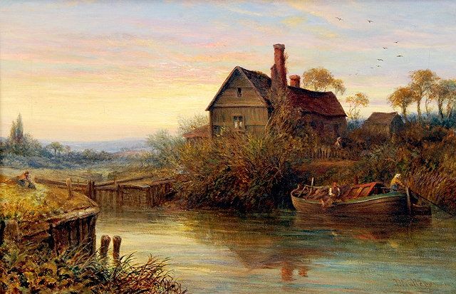 Canal Barge Before a Loch and Rural Cottage