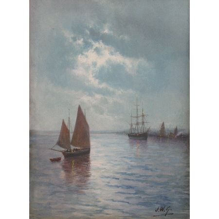 | Evening river scene with sailing boat in the foreground and other boats moored in the distance | |
