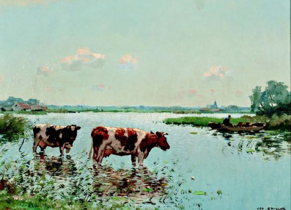 Landschap met rustende koeien in het water