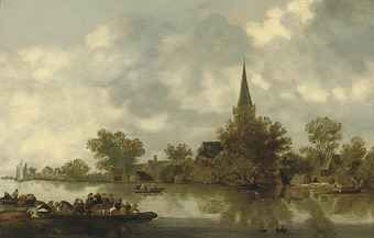 | A river landscape with a church, a ferry and figures in rowing boats | |