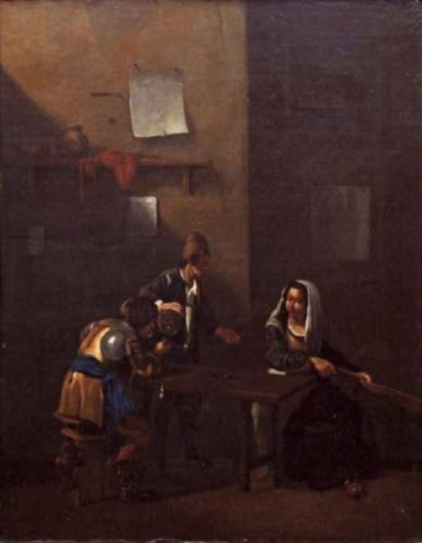 Scène de taverne avec fumeur, buveur et joueuse de guitare