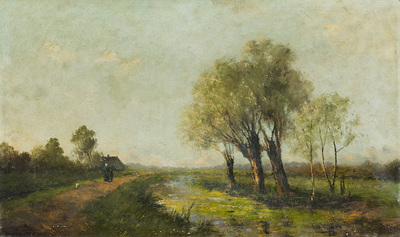 Holländische Landschaft mit Kanal und Bauersfrau auf dem Deichweg