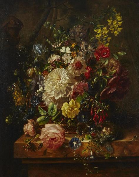 | FLORAL STILL LIFE IN A BASKET WITH A BIRD’S NEST | |