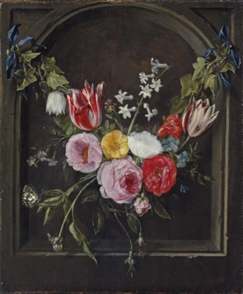 A swag of flowers hanging in a niche