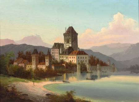 Prachtvolle Schlossansicht an einem See vor Gebirgshintergrund