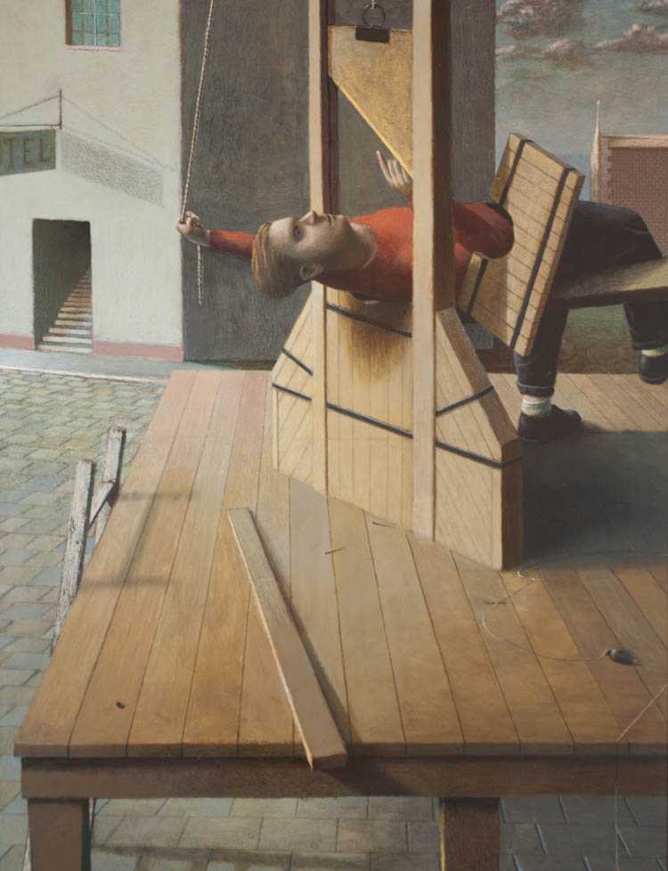 | "Public Execution," a man inspecting a guillotine in a precarious position | |