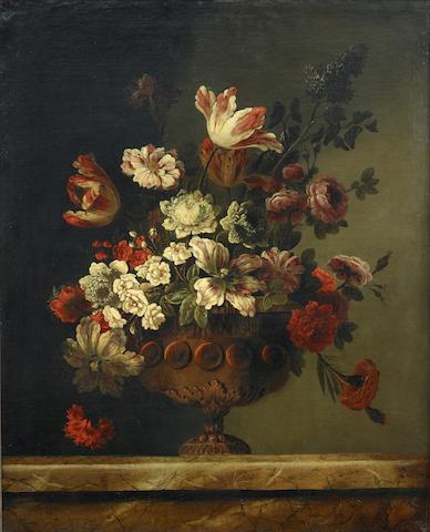 | Lilies, chrysanthemums, roses and other flowers in a bronze urn on a marble ledge | |