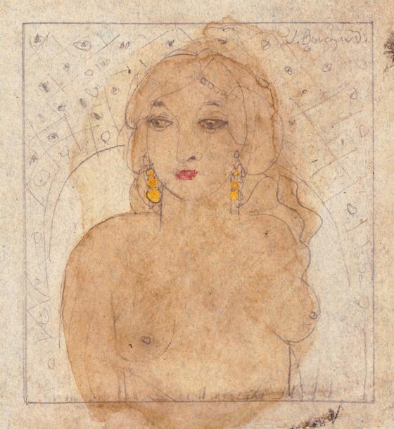 | Jeune femme orientale Crayon noir, aquarelle et rehauts d'or. | |