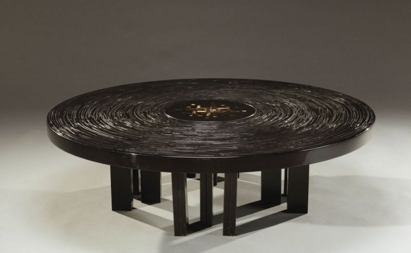 | Table basse à plateau circulaire en résine laquée noire présentant un décor au centre d'une mosaïque de corne taillée dans les t | |