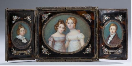 THREE PORTRAIT MINIATURES OF A FAMILY MOUNTED IN A FOLDING CASe
