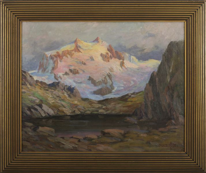 SNOW-COVERED MOUNTAIN LANDSCAPE WITH LAKE.